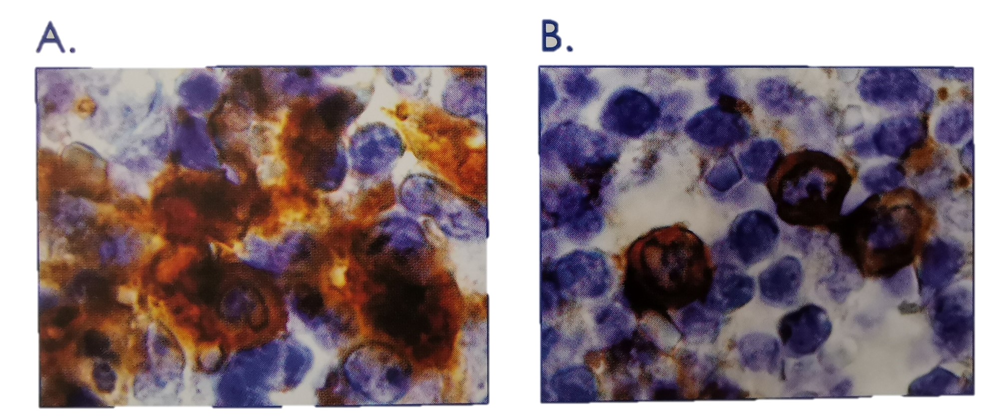 血清可以有效封闭非特异性结合。A. 用生物素标记的抗人CD14亲和纯化多克隆抗体(货号BAF383)检测石蜡包埋的人扁桃体组织中的CD14。使用碱性抗原修复试剂盒(货号CTS013)修复组织抗原。用HRP标记的高灵敏度链霉亲和素(HSS-HRP)和DAB染色并用苏木精复染(蓝色)。B. 在平行实验中,与一抗孵育之前用动物血清室温下封闭15分钟显著降低了非特异性背景染色。R&D Systems的所有细胞和组织染色试剂盒中都含有HSS-HRP和动物封闭血清。