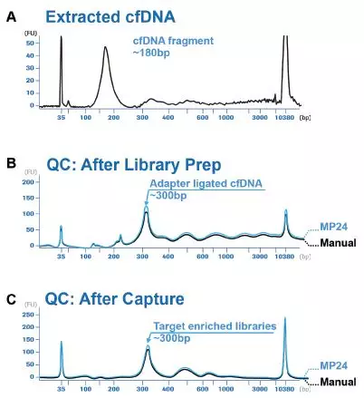 Agilent Bioanalyzer数据展示了采用MagNA Pure 24 Total NA Isolation Kit和MagNA Pure cfNA Buffer Set联合使用可更好的对小片段进行分离和富集。