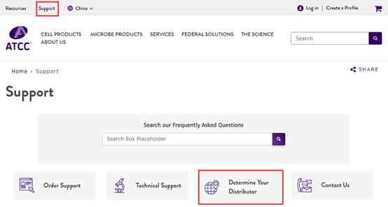 打开ATCC官网,点击Support,然后点击“Determine Your Distributor”。
