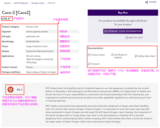 在产品详情页面上,可在页面左上角看到产品的基本信息,如产品的名称,货号,及其他基本信息;可在页面右上角看到产品说明书、COA、安全数据表、实验室方案(如有)等相关文档;可在页面中看到产品的生物安全级别,即BSL等级。