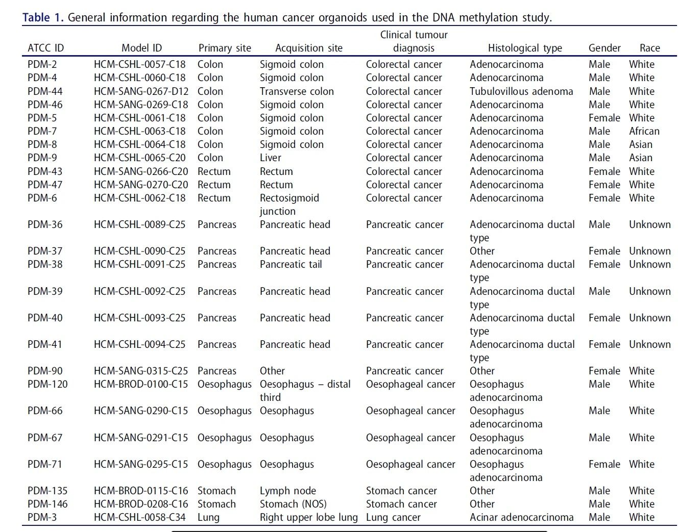 已发表的文献中,研究人员用来自Illumina的一种能查询超过850,000个CpG位点的微阵列芯片 Epigenetic Infinium Methylation EPIC Bead Chip (EPIC),对ATCC提供的25种人类癌症类器官(见表1)进行DNA甲基化状态做图景分析。