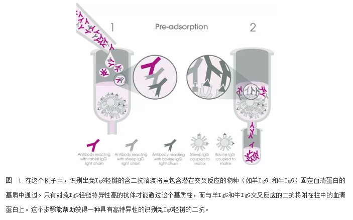 Pre-adsorption (also known as cross-adsorption) is an additional purification step used to increase the specificity of the antibody. The solution containing the secondary antibody flows through a matrix column containing immobilized serum proteins obtained from potentially cross-reacting species. The non-specific secondary antibody will remain in the column and the specific high secondary antibody will pass.