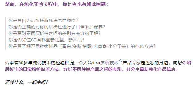 你是否因为层析柱超压进气而烦恼? 你是否正确的对你的层析柱进行了日常维护保养? 你是否对不同层析柱之间的差别有充分的了解? 你是否知道GE有哪些新柱型、新产品? 你是否了解不同种类样品(蛋白/多肽/核酸/内毒素/小分子等)的纯化方法? 传承着60多年纯化技术的经验积淀,今天Cytiva层析技术产品专家走近您的身边,向您介绍层析柱的日常维护保养方法,分析不同种类产品之间的差别,并分享最新纯化产品信息。2024-07-22 13:35:00.0