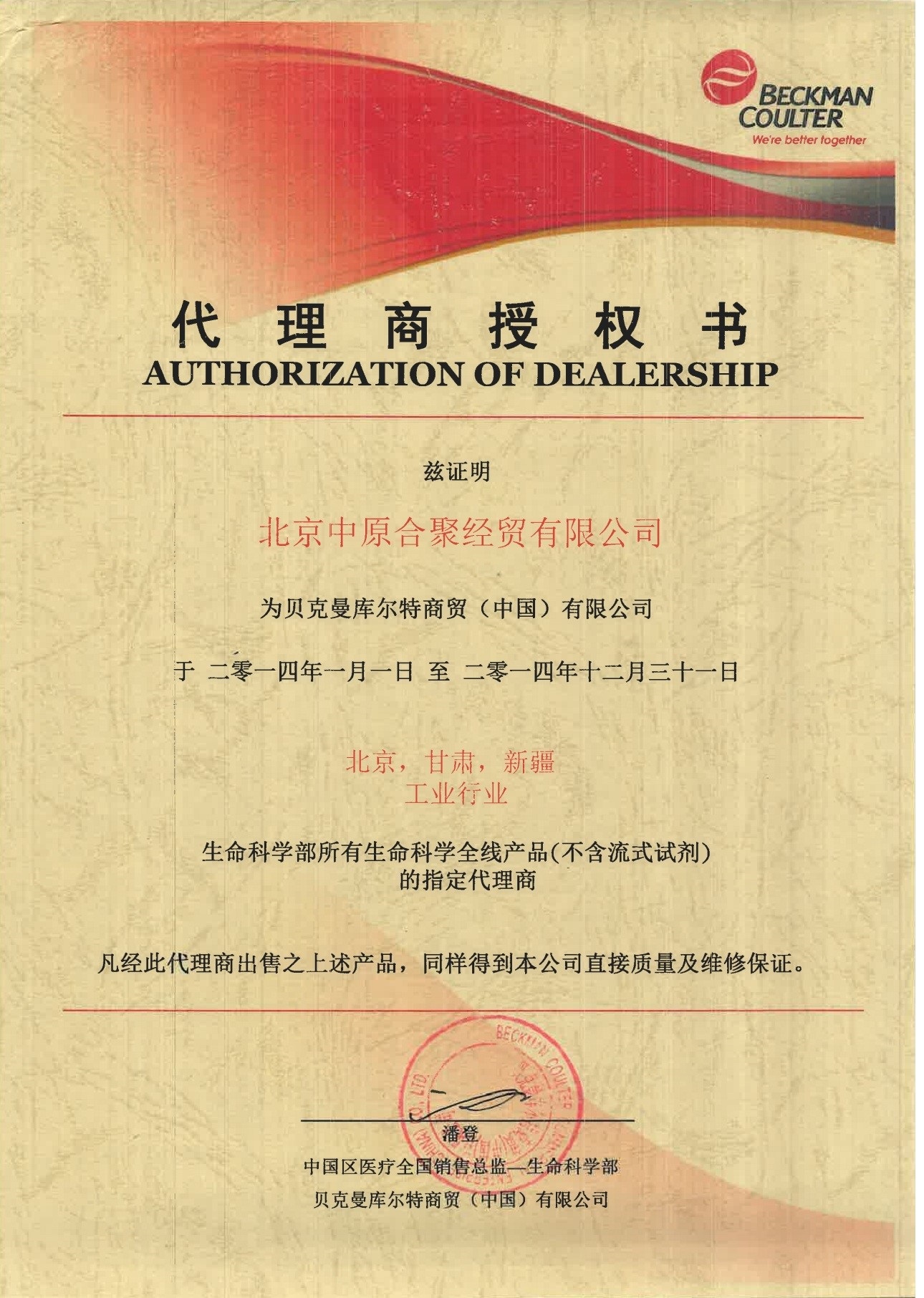 2014年1月1日,北京中原公司正式成为美国BECKMAN COULTER公司在中国北京、甘肃和新疆工业行业的指定代理商。