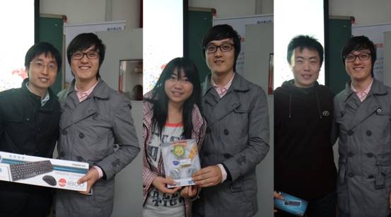 中原公司研究生交流论坛的一个重要环节,就是最激动人心的抽奖环节,除了每一位到场的老师和同学都能获得疯狂的小鸟一只外,我们还现场抽取了迷你键鼠,无线音乐耳机和无线键鼠套装三个大奖,恭喜如下获得大奖的三位幸运儿: