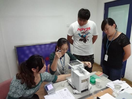 在博奥生物比赛现场,不仅有Rainin专业人员对比赛选手进行良好移液操作的指导,也有专业校准人员现场为移液器(不限品牌)进行测漏及日常性能测试。参赛选手们更是跃跃欲试,争相在现场进行操作。