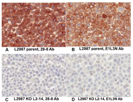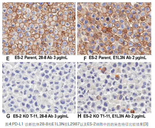 如图4,Abcam[28-8] vs CST [E1L3N],数据显示有些PD-L1诊断抗体并不特异[6],作者分别使用PD-L1 28-8和 E1L3N 抗体,对野生型和敲除的人肺腺癌细胞系L2987和人卵巢透明细胞癌细胞系ES-2的石蜡切片进行了IHC染色:在其他条件保持一致的情况下,两种抗体(2 ug/mL)在L2987的KO细胞中均未检出信号(图7A-D);28-8(3 ug/mL)在ES-2的KO细胞中未检测到信号,但E1L3N(2 ug/mL)却呈现了非特异的胞浆染色(图7E-H),这可能是因为识别了胞浆中的非PD-L1抗原[7]。