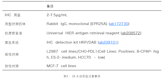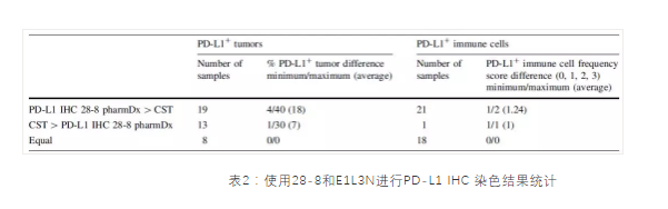 对20名NSCLC和20名黑色素瘤患者的TC和IC的IHC检测结果显示:相对于E1L3N,28-8是一个更优秀的伴随诊断抗体[3]。