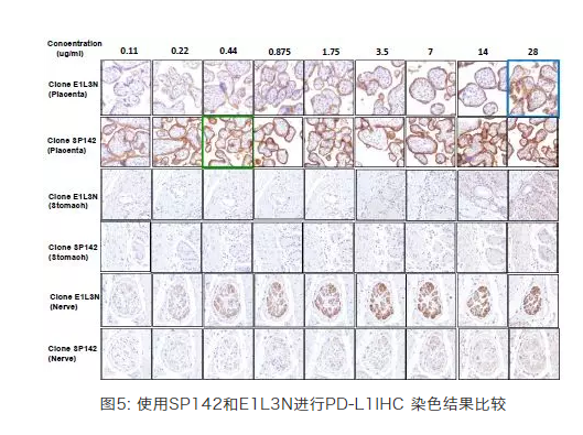 Abcam已与Spring Bioscience签署了独家协议,由Abcam独家提供其经IHC应用优化的重组兔单抗SP克隆产品线。SP克隆是被开发专用于病理学和癌症研究的抗体。它们使用与Abcam现有 RabMAb® 兔单抗相同的技术,能确保高特异性,高灵敏度,及批次间的一致性。包括关于FDA批准的PD抑制剂Tecentriq的补充诊断抗体SP142(图5),该抗体同时也被国内第一家申报上市的PD-1单抗(君实JS001)作为诊断抗体。与竞争对手的E1L3N相比,无论特异性还是灵敏度,SP142都更胜一筹[7]:当对Placenta染色时,SP142的工作浓度为0.44 μg/mL,而获得同级别染色强度的E1L3N为28 μg/mL;与此同时在使用E1L3N对Stomach和Nerve的IHC结果中出现了非特异的染色信号,而SP142并未出现此类结果[7]。