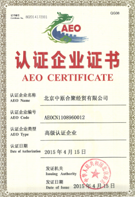 中原公司在进出口方面严格遵守国家法律法规,一直保持着优良的海关记录,2010年被中国海关总署评为AA类进口企业,2015年成为AEO高级认证企业,实现了进出口快速通关以及极低的海关查验率。