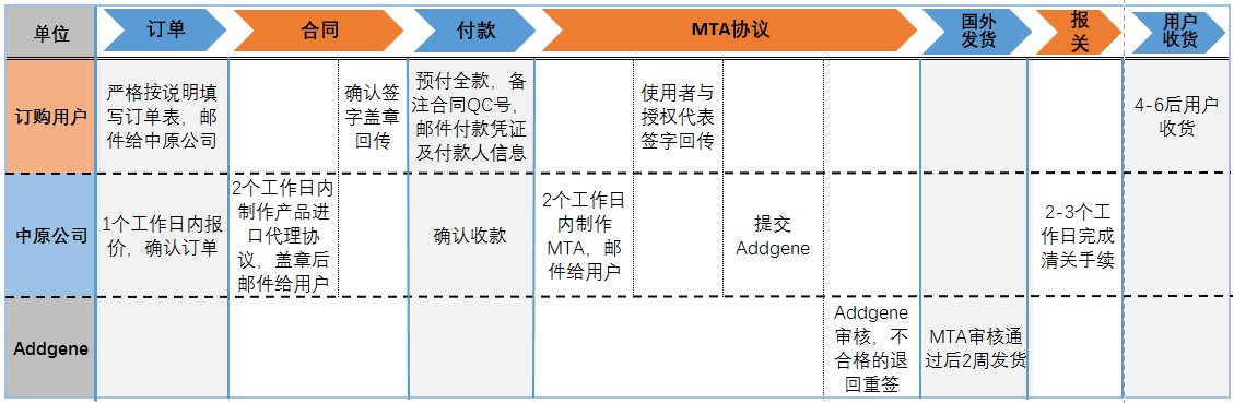注意:《Addgene产品代理进口协议》、英文MTA均签署回传,且已经查到您的付款,才会给ADDGENE下单。仅提供了《Addgene产品订单表》不表示已经下单了。