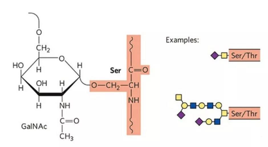 再来看一下O连接的糖基化,O-糖在个体发育、肿瘤发生、细胞粘附等诸多生命活动中均发挥重要作用,但是由于缺乏共有修饰序列信息和有效的分析手段,因此对O连接的糖基化修饰知之甚少。O连接的糖基化是由不同的糖基转移酶催化的, 每次加上一个单糖,最后在糖链末端加上唾液酸残基(图中紫色方块)。