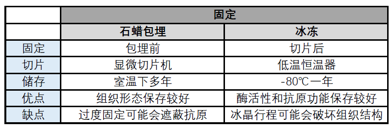冰冻组织切片的处理过程比石蜡包埋切片快捷。但是,要长期保存组织,冰冻是不够的,而且冰晶的形成可能会破坏亚细胞结构。此外,冰冻切片通常比石蜡切片更厚。因为冰冻组织中的酶仍然具有活性,封闭可能会影响IHC监测的酶的活性就显得尤其重要。