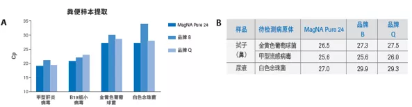 A)粪便是极具挑战性的样本,而 MagNA Pure 24系统在4个待检测病原中均表现较好。