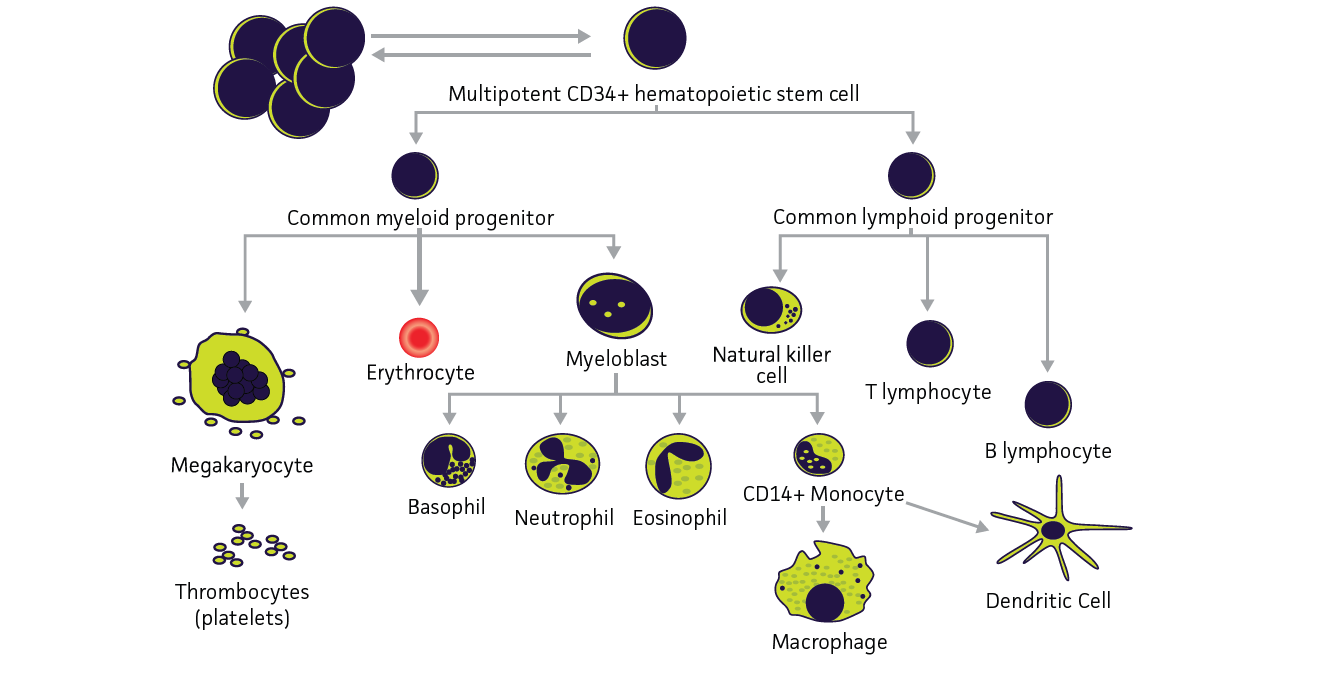 原代细胞中的多潜能骨髓和脐血CD34+造血干细胞可诱导产生更多的干细胞或普通骨髓或淋巴祖细胞。然后这些细胞再产生免疫系统中分化程度更高的成分,然后可能迁移到组织中进行进一步特化。此外,该系列中的外周CD14+细胞可诱导分化为树突状细胞或巨噬细胞。最后,来自骨髓或外周血的单核细胞可分化为包括巨噬细胞、树突状细胞、单核细胞和淋巴细胞,以及一小部分造血细胞(图1)。