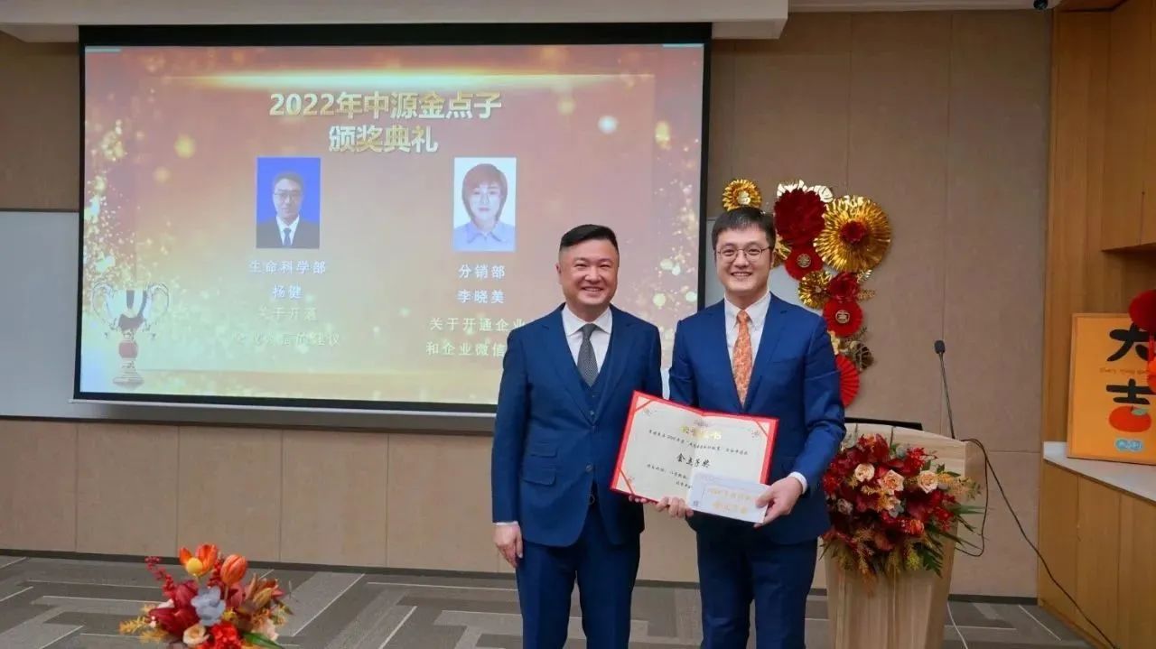 中源公司非常重视来自基层的每一个声音,公司的发展离不开员工们的思想涌动和创新思维。为鼓励每一位中源人积极地参与到公司发展建设中,每年公司都设立了“金点子奖项”。2022年度,两位同事并列荣获“金点子奖项”,他们分别是生命科学部杨健及分销部李晓美。