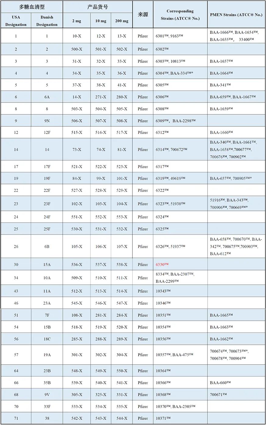 ATCC从MERK和PFIZER公司获得肺炎链球菌多糖(这些产品由MERCK和PFIZER公司生产,抗原性也分别由其验证)。它们与目前市面上可买到的疫苗的血清型相同。