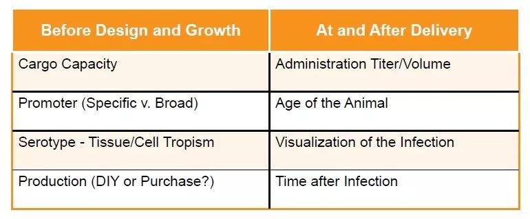 关于AAV在体内的传递,有几个因素是不同的,这取决于您选择的生物系统。这些因素对感染的成功程度有很大的影响。无论您的应用是什么,下面列出的一些参数,您可能需要在注射病毒之前考虑: