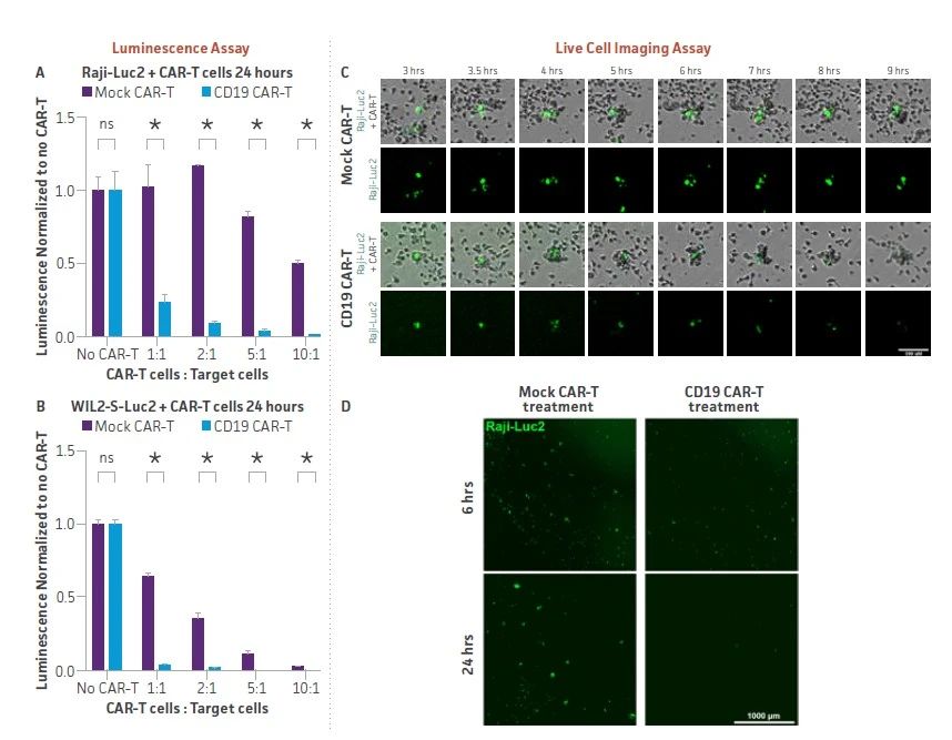 图 2:CAR-T靶向荧光素酶报告细胞可被纳入多种CAR-T疗效检测中。(A)表达CD19的Raji-Luc2细胞(B)WIL2-S-Luc2细胞作为CD19 CAR-T或Mock CAR-T(对照)效应细胞的靶细胞,来自同一供体的效应细胞与靶细胞的比例为所示。加入荧光素酶检测底物,并检测发光信号。信号消失表示细胞死亡;通过CD19靶向的CAR-T细胞的剂量依赖性特异性杀伤大于用模拟CAR-T细胞观察到的非特异性杀伤。此外,用细胞标记染料对Raji-Luc2细胞染色,然后在与CD19 CAR-T效应细胞共培养期间进行实时荧光成像测量。(C)Raji-Luc2细胞(绿色)被效应T细胞包围,与Mock-CAR-T细胞共培养相比,导致荧光下降。(D)在CD19 CAR-T效应细胞共培养6小时和24小时后,研究学者们观察到荧光细胞的数量减少;然而,在与Mock CAR-T细胞共培养时,有许多Raji-LUC2细胞存在。这些结果表明,ATCC CAR-T靶向荧光素酶报告细胞可用于实时评估CAR-T细胞在生物发光实验和活细胞实时成像中的潜力。