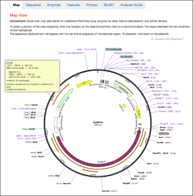 This is the first tab you’ll land on after clicking the “Analyze Sequence” button. The maps hosted here retain all the features shown in the static maps discussed above, but also have interactive functionalities. You can now hover over any feature, enzyme, primer, or ORF to learn more information about it. For example, if you hover over the ampicillin resistance gene you’ll find the full name of the gene, the name of its gene product, and a description of its function. You can also click one location in the plasmid and then a second location to select the sequence between the two locations and send it to the clipboard for copy and paste functionality.