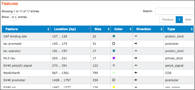 The table found here lists the common features detected in the plasmid sequence. The table includes feature names, locations, sizes, colors used to indicate them on the map, direction (if relevant), and types. Types listed are standard GenBank feautre types. Clicking on a particular feature here also highlights that feature in the “Map” and “Sequence” tabs.