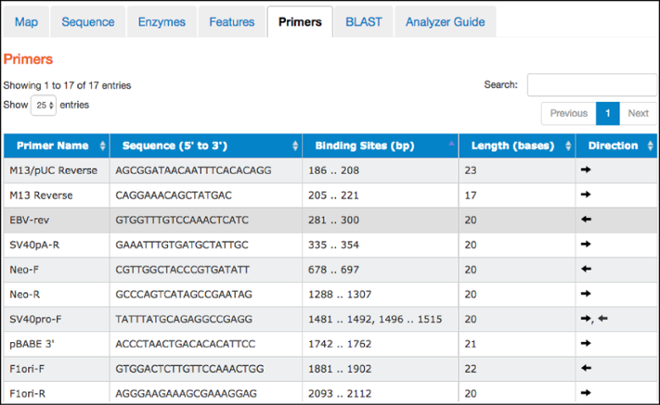 This tab contains a table listing commonly used primers detected in a given nucleotide sequence. The table includes primer names, sequences, binding site locations, lengths, and direction. Clicking on a particular primer here also highlights it in the “Map” and “Sequence” tabs.