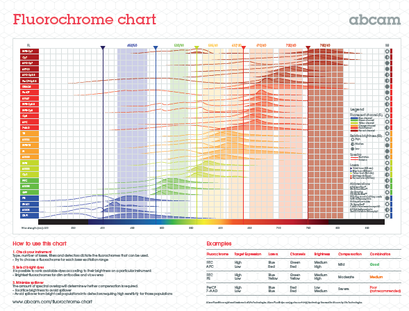 Fluorescent dyes (or fluorescein) are commonly used as detection reagents for a variety of applications, including cell imaging and flow cytometry. Fluorescent dyes absorb light energy at specific wavelengths and then re-emit light energy at longer wavelengths. The wavelengths at which the fluorescent dye absorbs and emits light constitute the excitation and emission spectra (or simply fluorescent dye spectra) of the fluorescent dye, respectively.